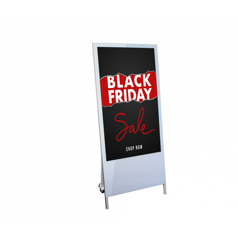 Batteri-drevne | Annoncer i op til 12 timer. Det ledningsfrie design betyder, at du kan lade din digitale A-frame skilt sikkert stå i fodgængerområder. |