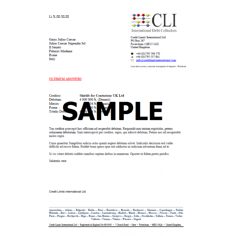 CLI Debt Collection Letter is designed to be a payment accelerator for your overdue accounts whether your customers are located in the UK, Europe, Middle East, Africa, America or Asia. CLI debt collection letters are not only in the local language of your customer: they are in the communication style used in the country where your customer is based. This is why they generate the best results, accelerate payment of your overdue invoices and improve your cashflow. We recommend the use of our International Debt Collection letters for debts up to 180 days overdue. However, as you know, debts do not age well and the quicker you chase your overdue accounts, the more likely you will be to successfully recover your money.