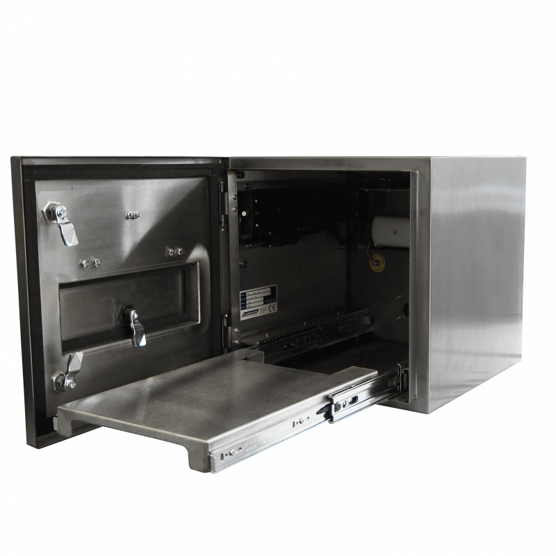 Tingkatkan alur kerja operator dengan memasang printer di lingkungan basah atau steril. Kandang printer ruang bersih IP66 melindungi printer dari masuknya air dan pembersihan harian. Kabinet baja tahan karat 316 bersifat antibakteri dan tahan korosi, sehingga ideal untuk industri dengan peraturan kebersihan yang ketat.