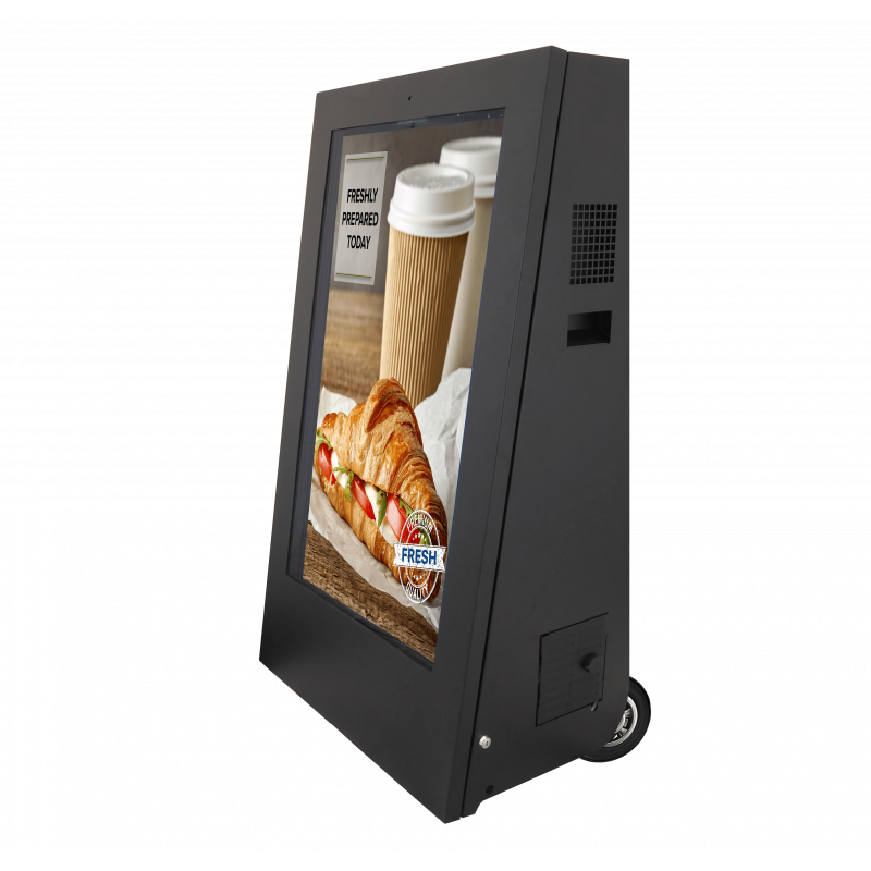 • 잠금 식 휠 : 고객을 끌어 들이기 위해 디지털 샌드위치 보드를 가장 좋은 위치로 쉽게 옮길 수 있습니다.