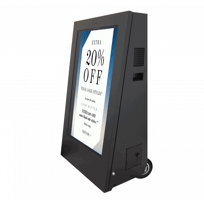 Zamykane kółka pozwalają przenieść jednostkę w najbardziej widoczne miejsce. Bateria zapewnia cały dzień reklamowy, a 43-calowy ekran o wysokiej rozdzielczości angażuje klientów w Twoje promocje.