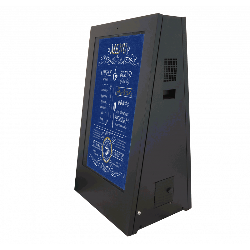 Envolva os clientes com o quadro A digital de dois lados. Duas telas de 43 polegadas atraem a atenção dos transeuntes e impulsionam as vendas em seus itens promovidos.