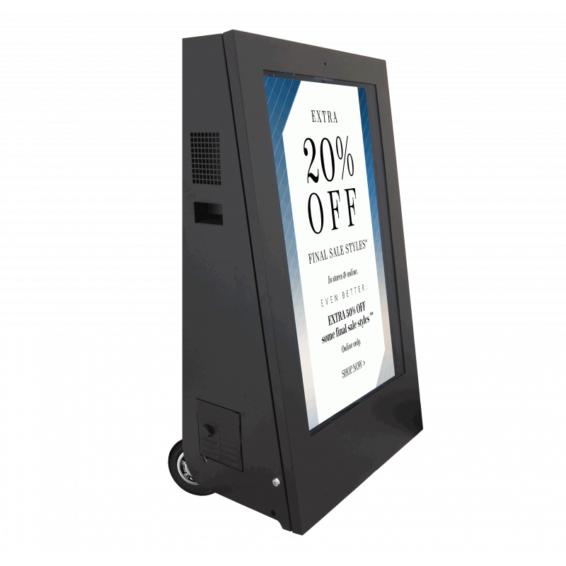 Uma tela de 1.000 NITS mantém suas promoções legíveis sob a luz do sol. A bateria fornece até 10 horas de publicidade e uma classificação IP56 protege o quadro A da água e poeira.